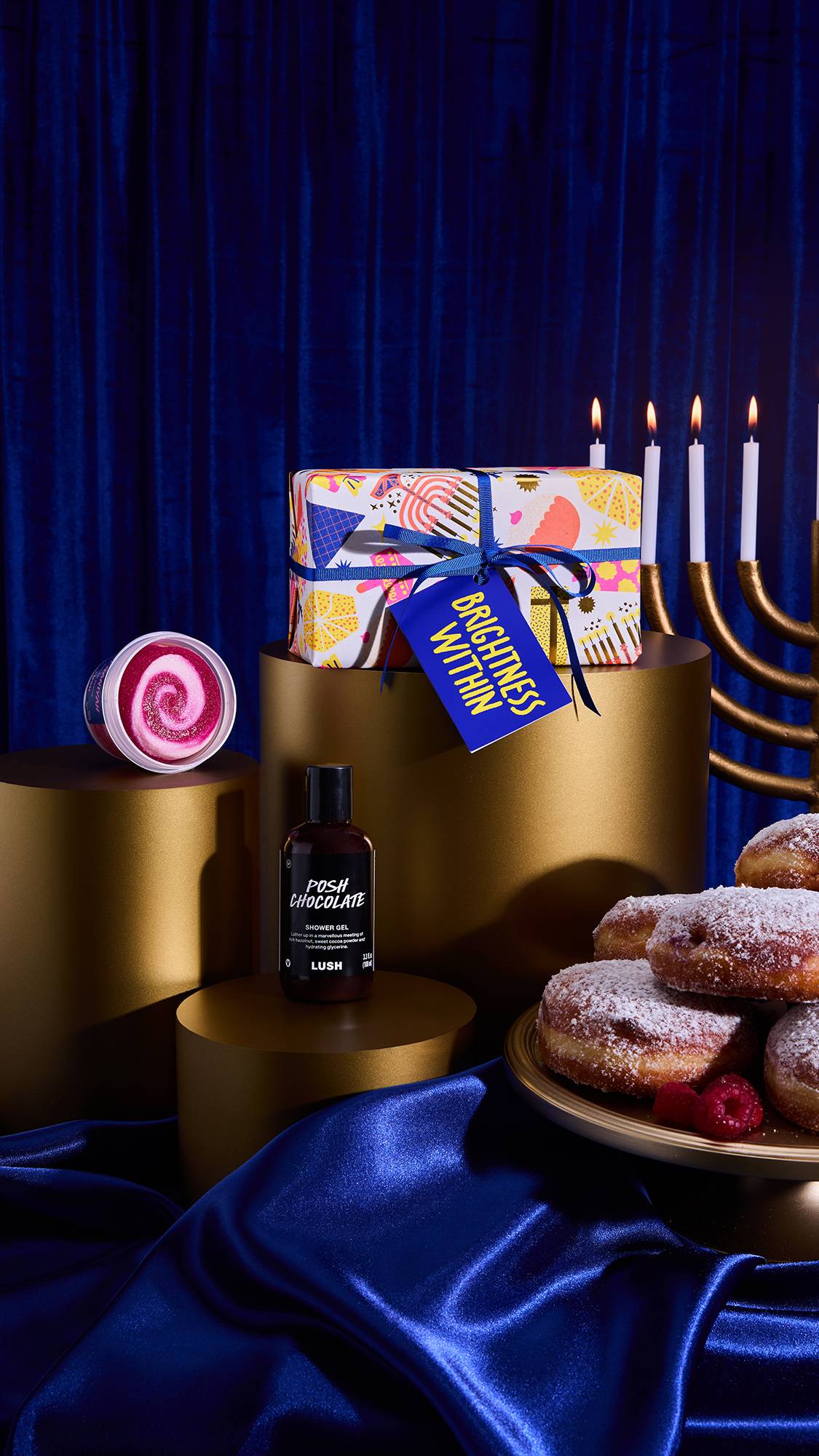Celebrate the light within each of us this Hanukkah with this gift containing two sweet shower treats. If you’ve made your way through your chocolate gelt and jam donuts, keep the festivities going with the Sufganiyah Sugar Scrub and Posh Chocolate Shower Gel. We shine brightest together, so share this with those you love.