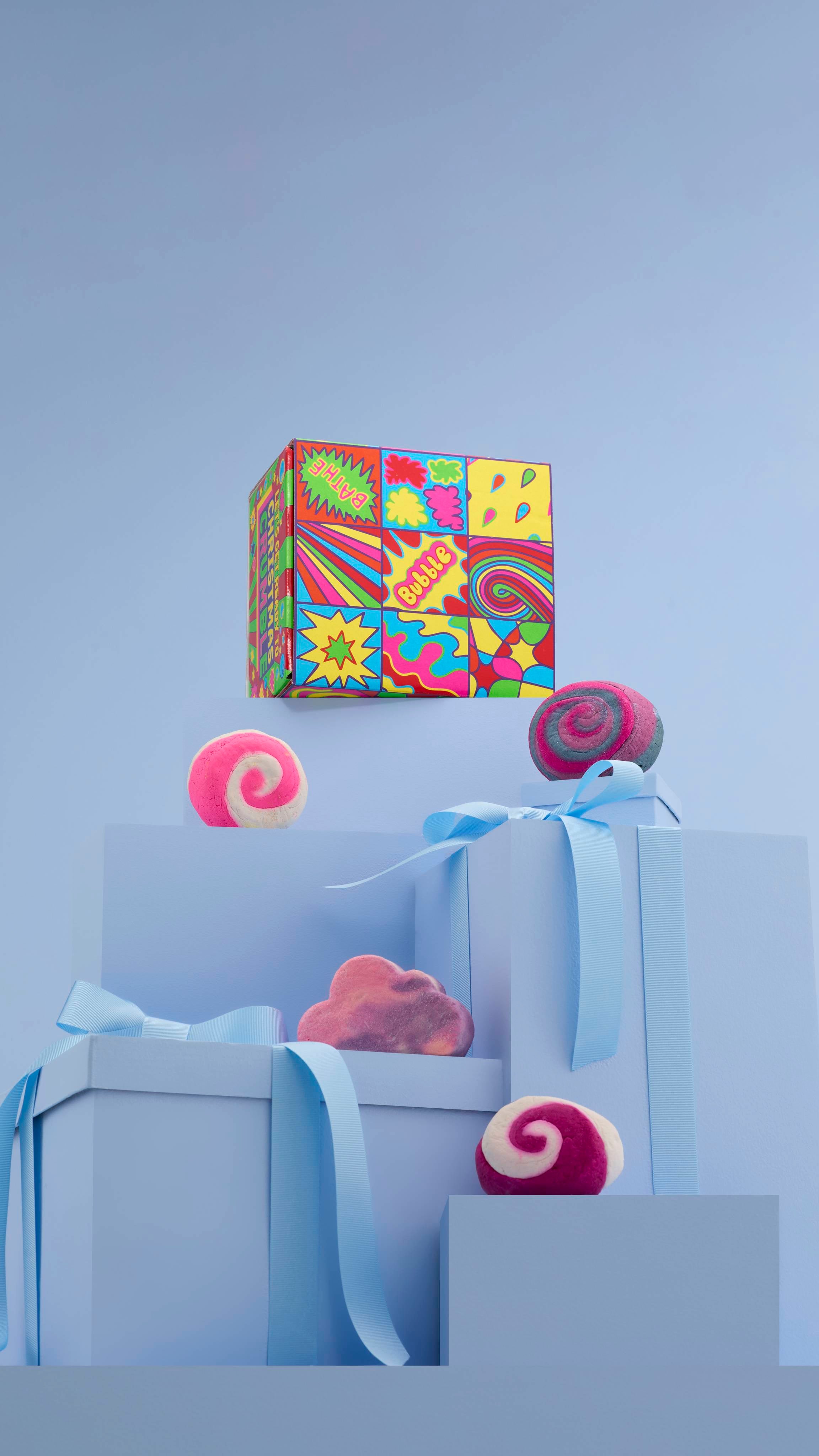 Lush Creative Artworker Georgia Haywood, says, “This gift design was inspired by the bold colors, iconic motifs and punchy patterns of the Pop Art movement, blended with the playful themes of bubbles and festive bath time fun.”